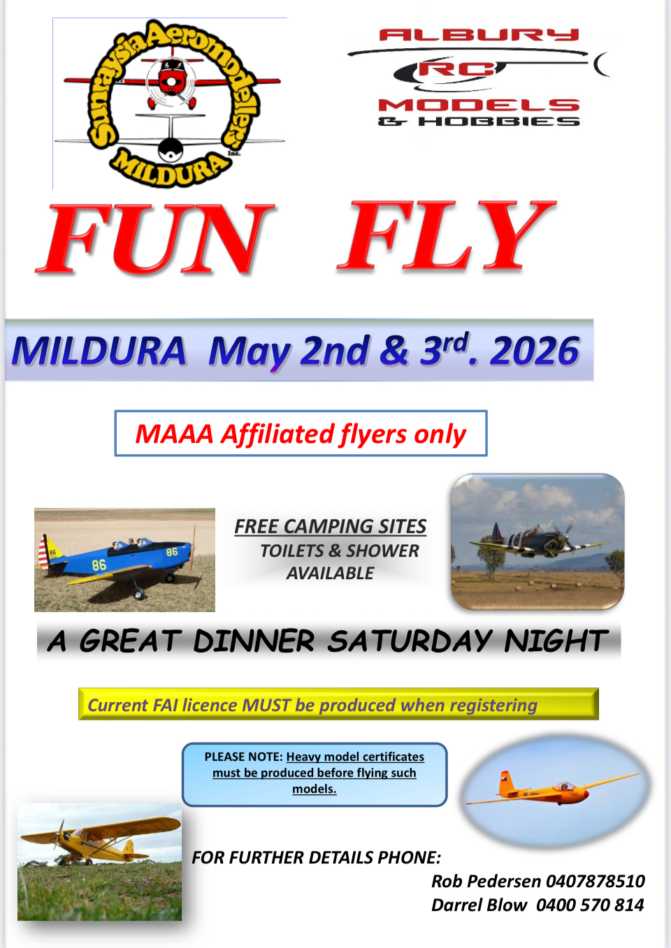 Sunraysia Aeromodellers annual fun fly is on again. Come along and enjoy the great the company and awesome facilities for two fun packed days of flying. All disciplines welcome.