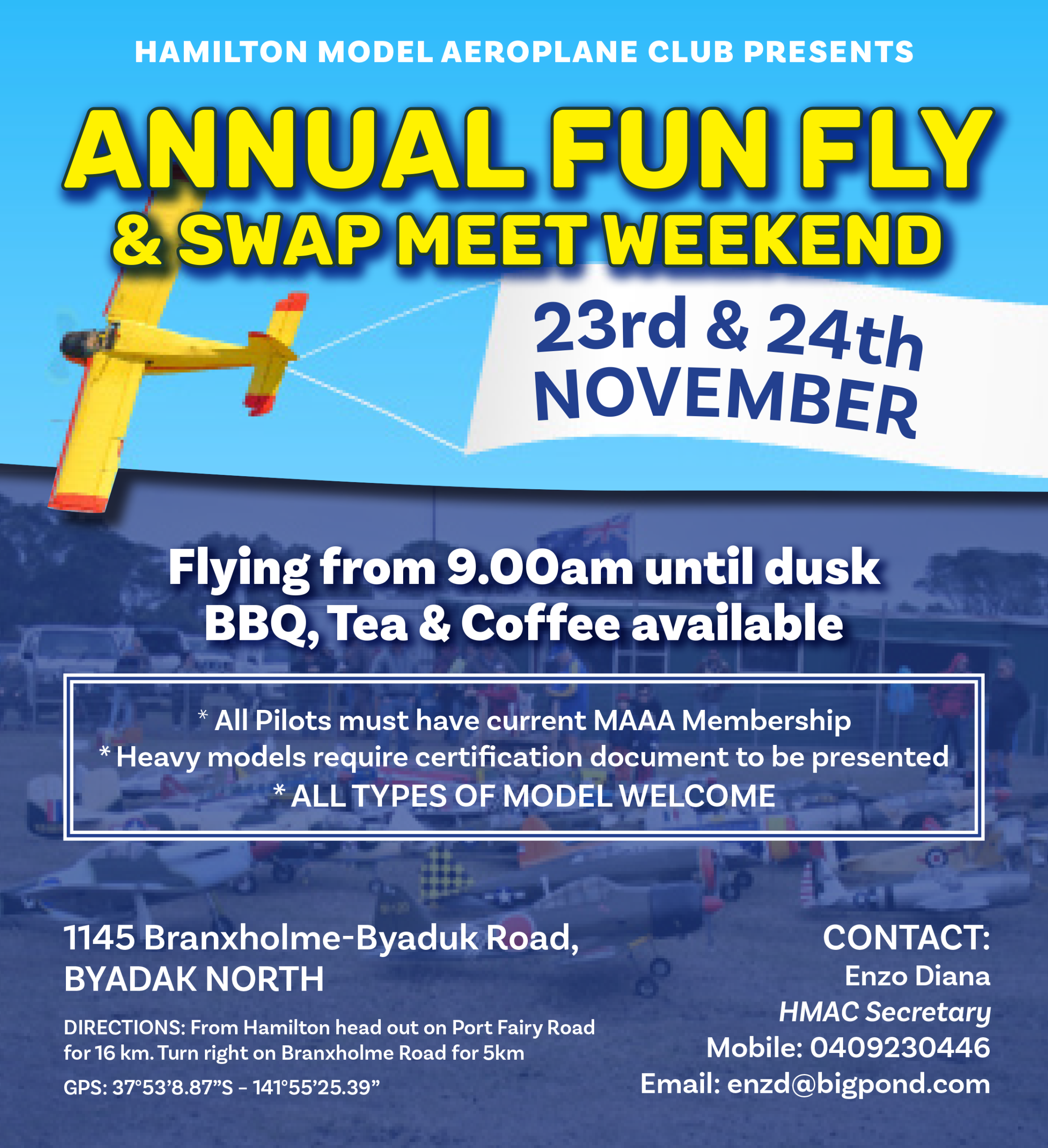 Come and enjoy a great weekend of flying and swap meet at the Hamilton Club.Flying from 9.00 am till dusk.Great amenities, and BBQ available.Contact Enzo for more detailsHope to see you there.